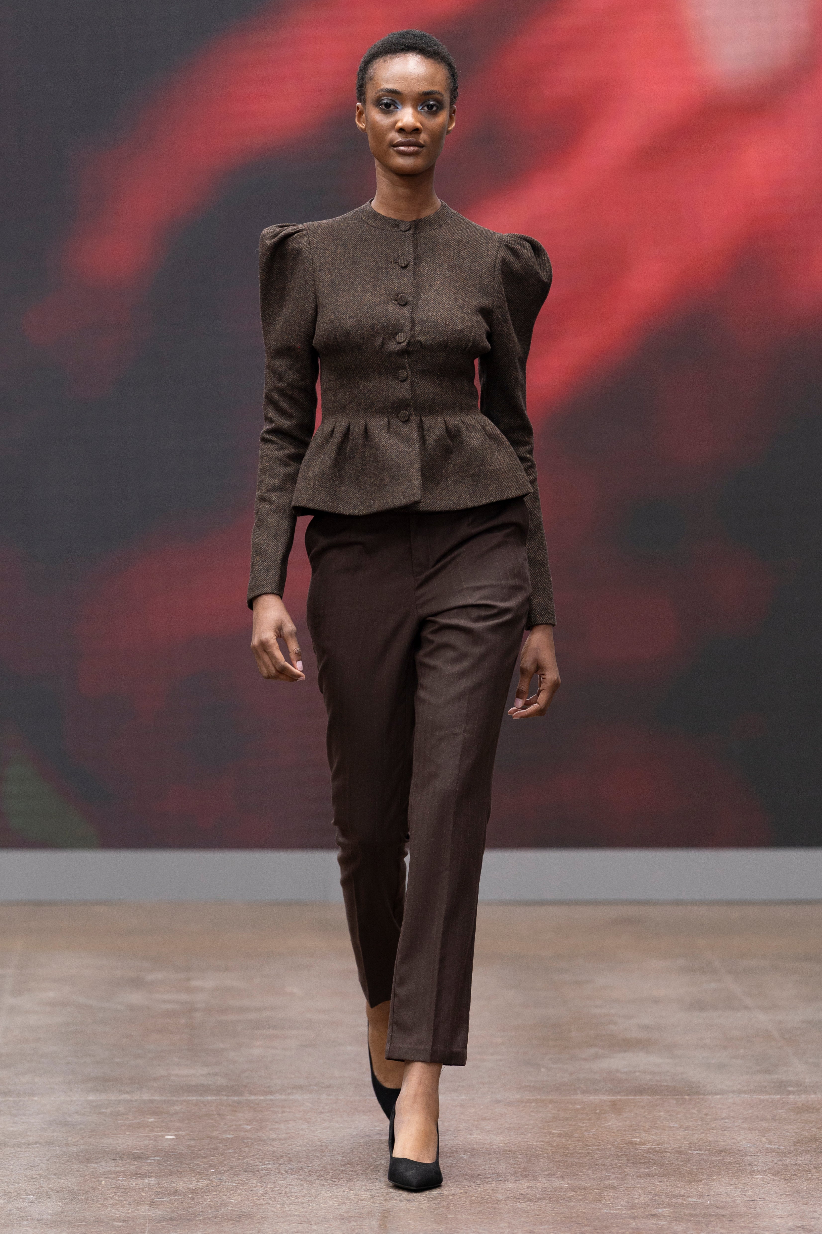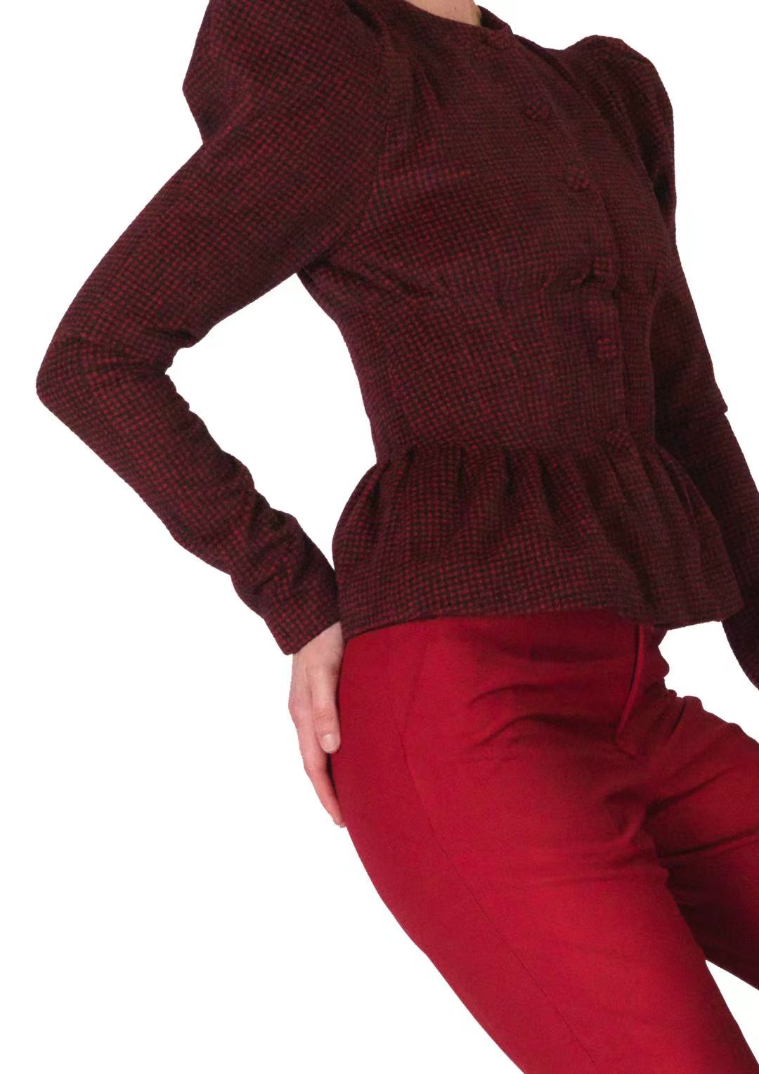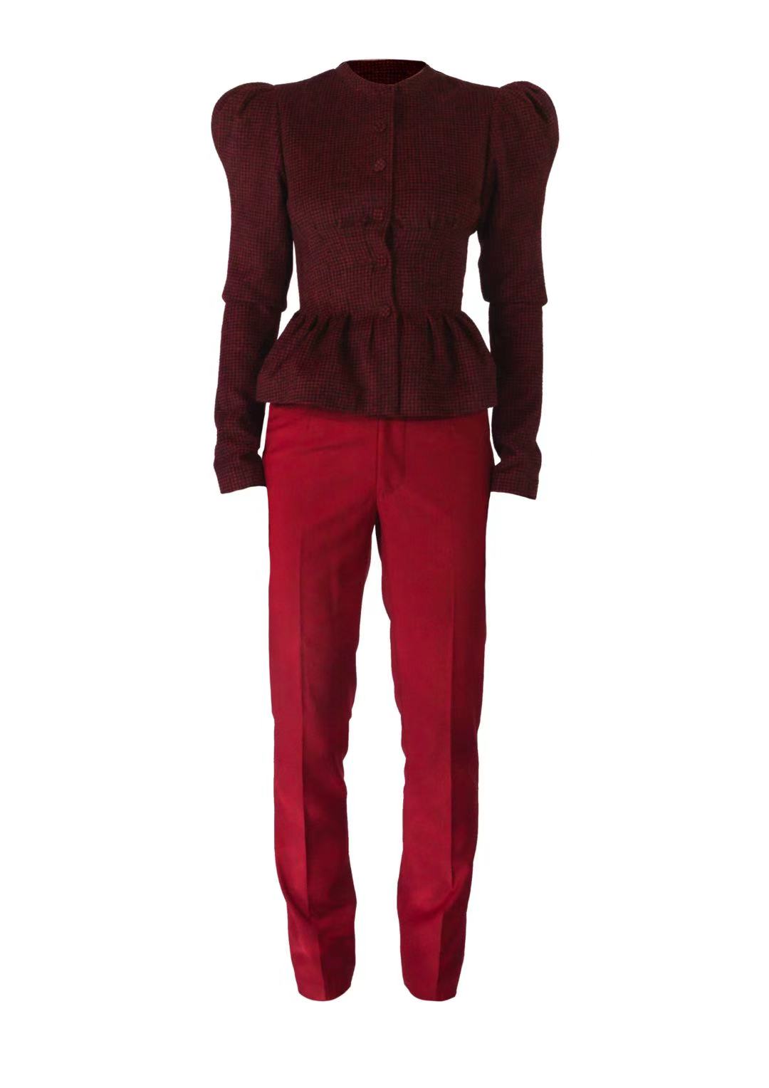 An exploration in tonal variance, the Scarlet Suit pairs a structured, historicist blouse with the clean grammar of a modern trouser. The silhouette is a dialogue between volumes—a romantic puff sleeve and soft peplum are anchored by the lean, uninterrupted line of the pant below. Crafted in contrasting textures of a single hue, it is a statement of nuanced confidence, drawing power from its subtlety.