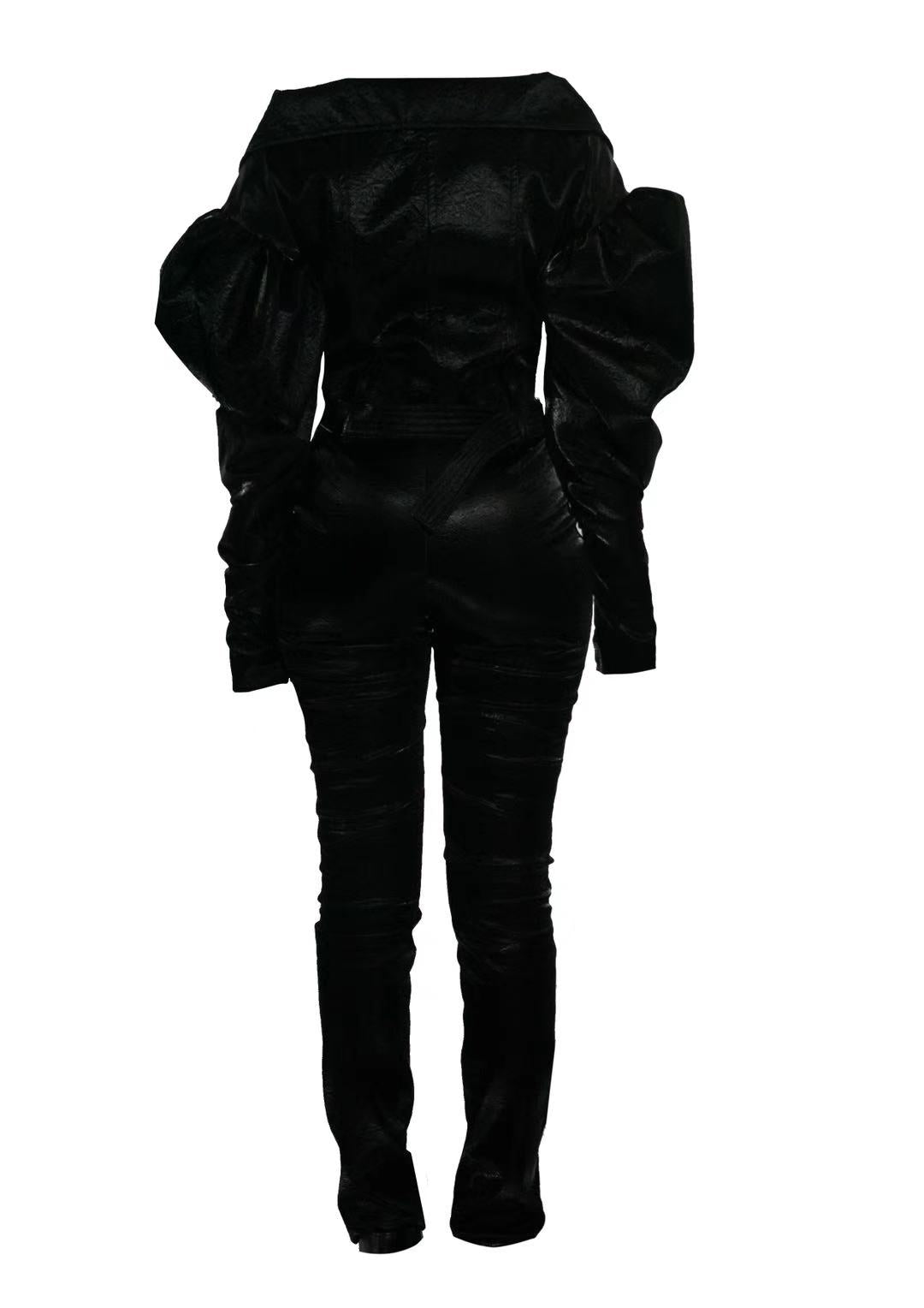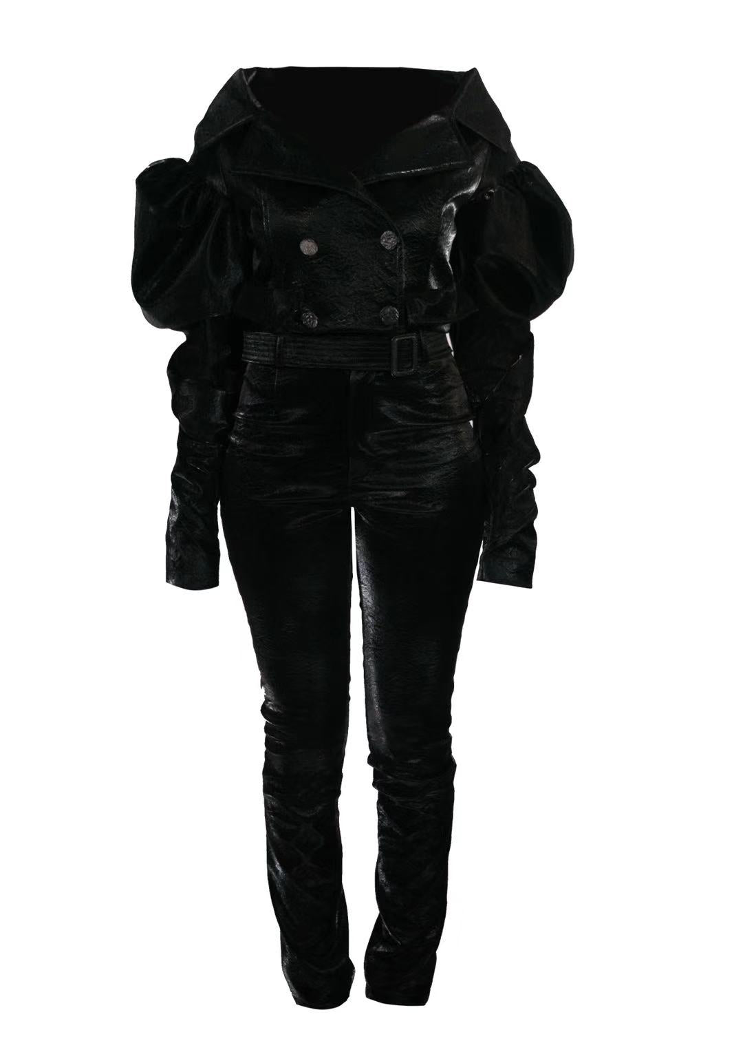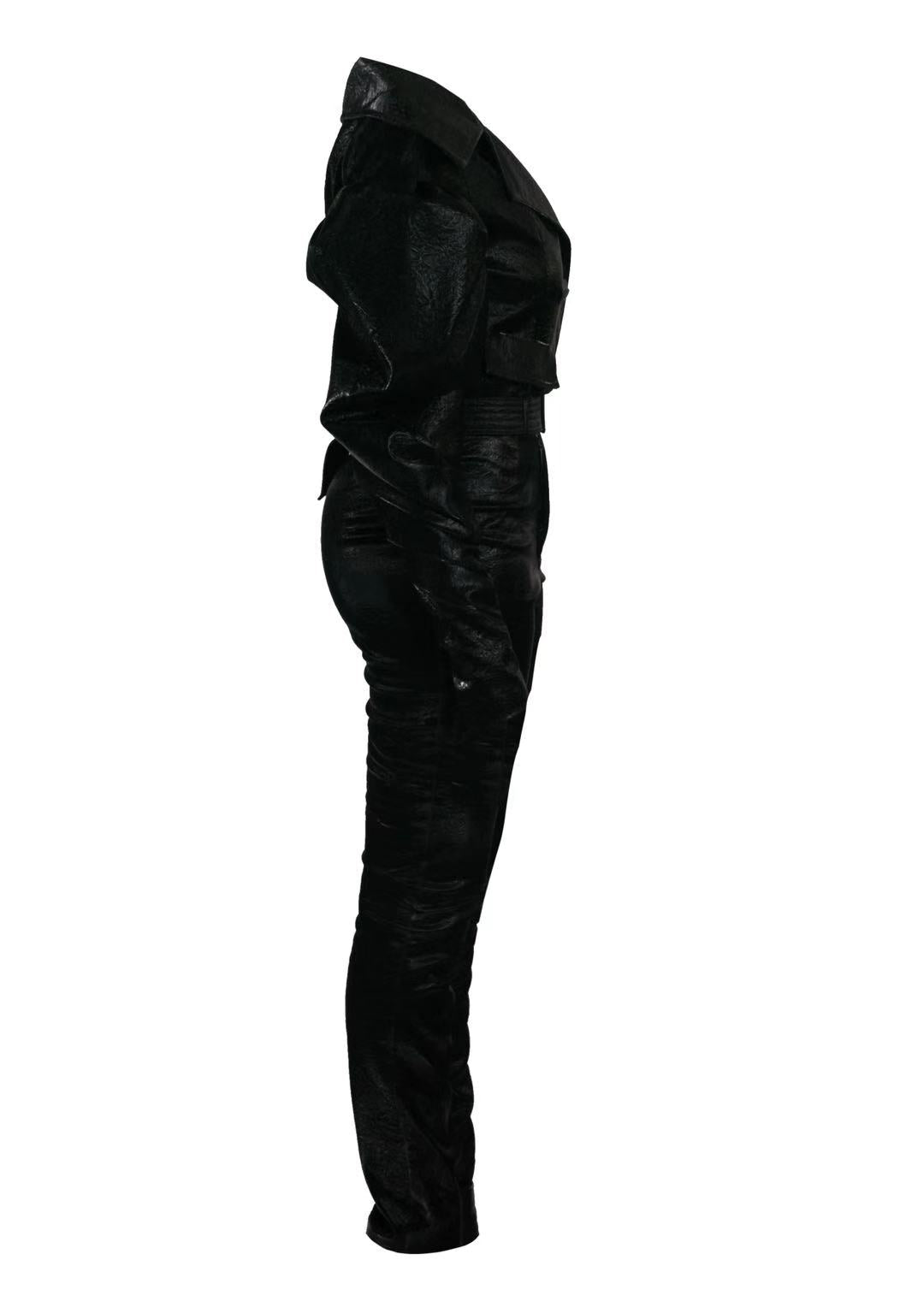 A meditation on precision and poise, the Stazie Set reimagines classic tailoring through a minimalist lens. The black jacket—cut in structured wool with a subtle sheen—features a clean front closure and sculptural collar that frames the neckline with quiet authority. Slim trousers mirror its restraint, tapering with intention to elongate the silhouette. A coordinating belt defines the waist, drawing the eye inward to a center of gravity.