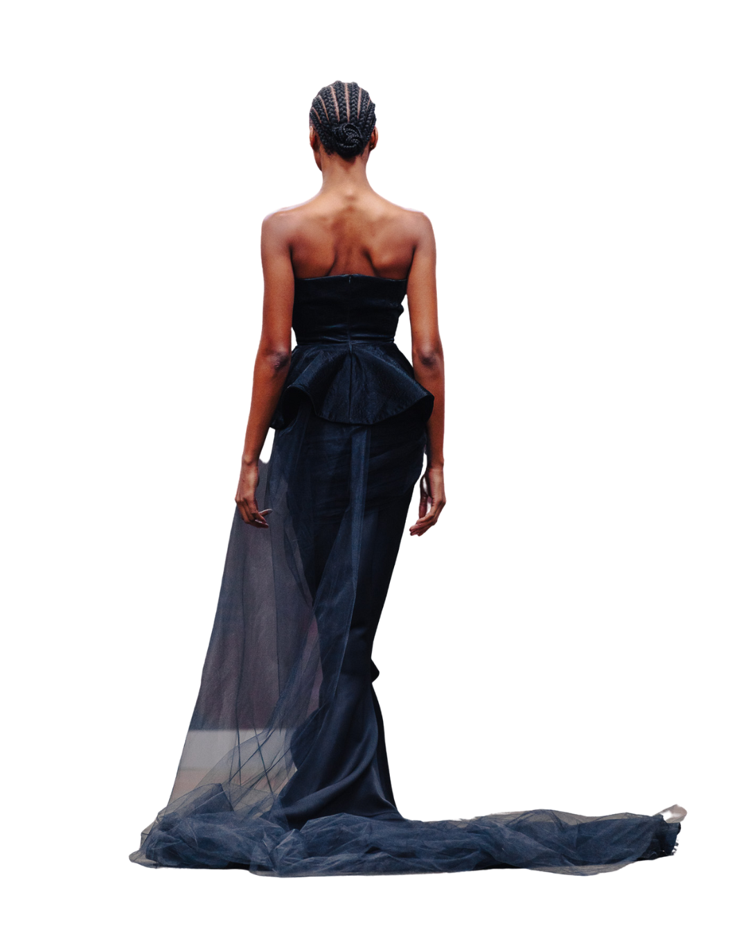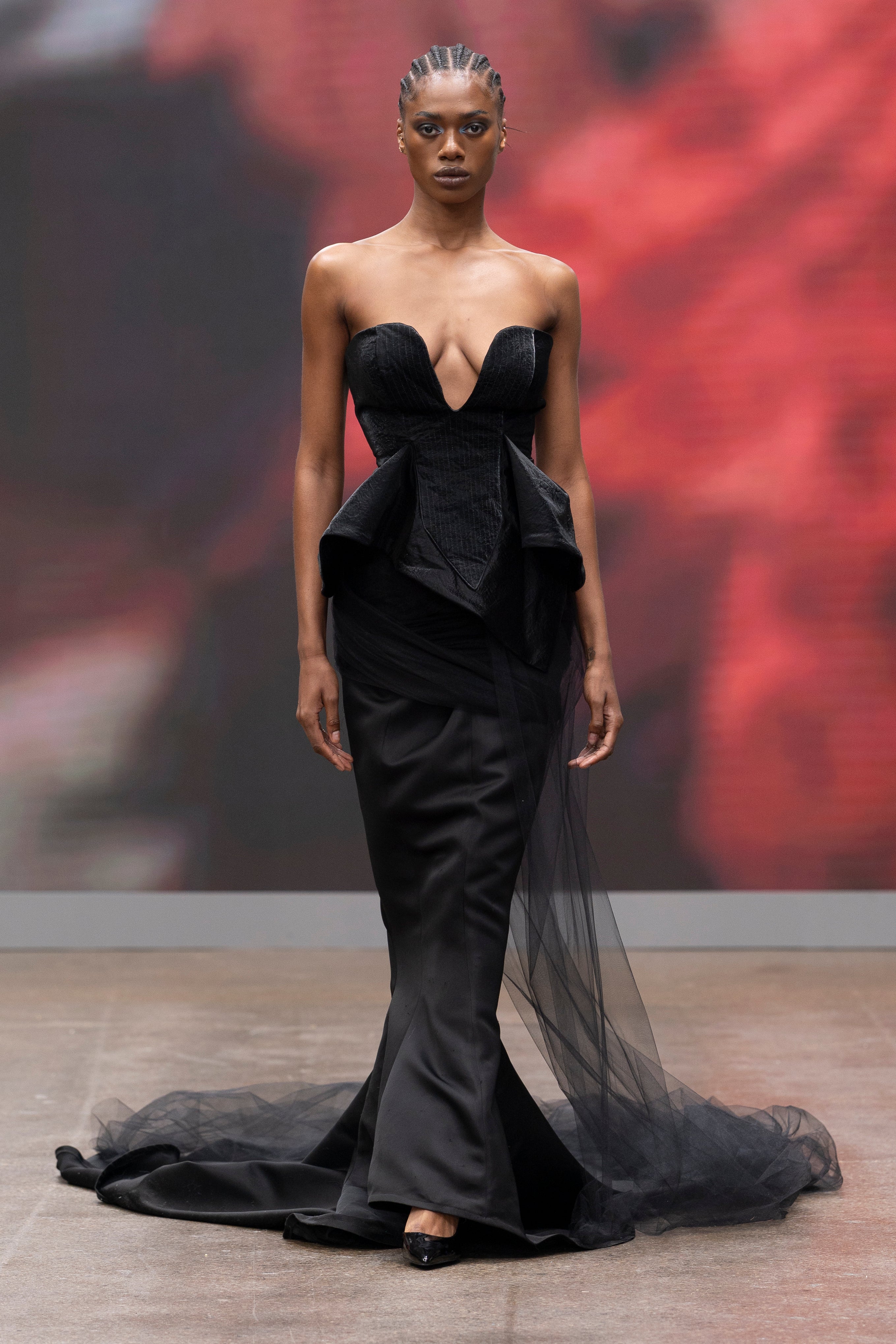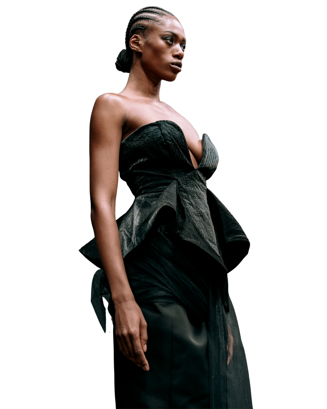 This asymmetrical black gown sculpts the body with a corseted bodice that rises into winged shoulders, evoking both flight and fortitude. A plunging neckline and central button detailing draw the eye downward, while the high slit cleaves through the draped skirt like a decisive gesture. The silhouette is engineered to elongate, revealing one leg in stark contrast against the matte black folds.